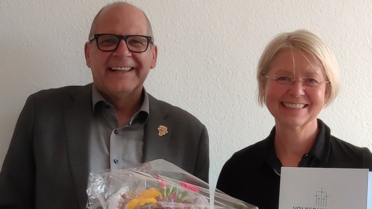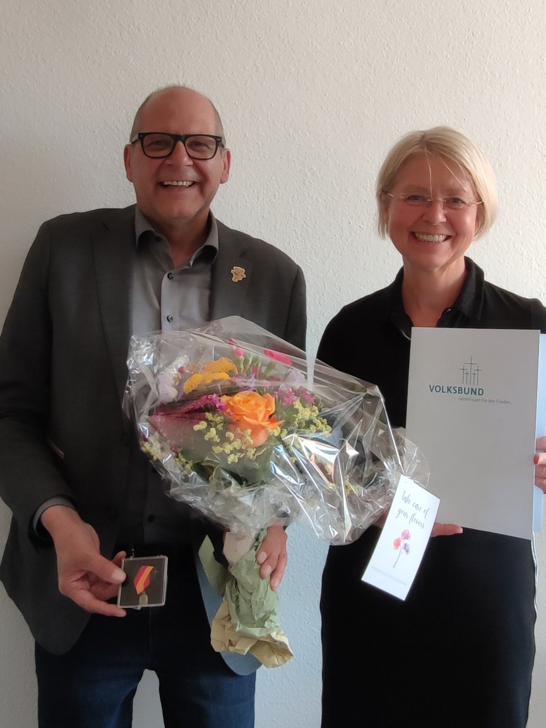 Da Frau Reich-Gutjahr nicht teilnehmen konnte, wurde ihr im Rahmen einer kleinen Feierstunde in unserer Geschäftsstelle in Stuttgart die Ehrennadel des Volksbundes in Bronze überreicht. Geschäftsführer Johannes Stocker dankte für das seit 2018 erbrachte ehrenamtliche Engagement und freut sich auf eine weitere konstruktive Zusammenarbeit.